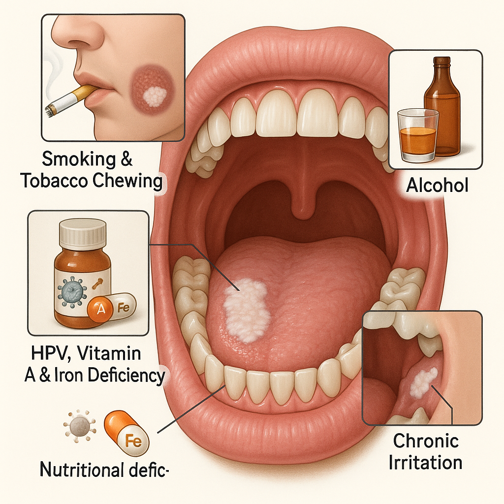 Tobacco (smoked and smokeless) – Most cases are linked to tobacco consumption, which causes epithelial hyperplasia, keratinization, and dysplastic change.