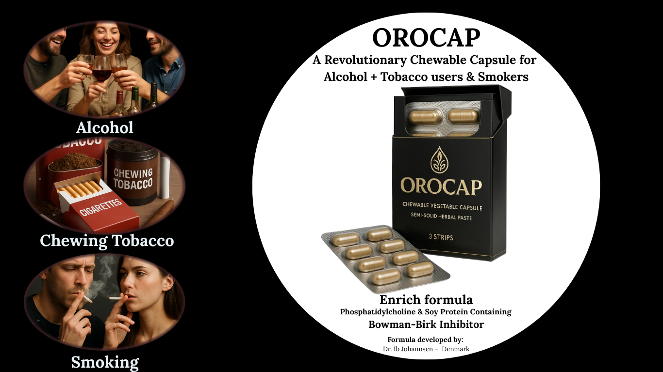 Orocap™ is the world’s first chewable vegetable capsule with a semi-solid phytotherapeutic paste with Bowman-Birk Inhibitors (BBI) and six essential Phospholipids, designed for direct oral mucosal application. Developed to heal damaged by tobacco, alcohol, and smoking. It is specifically engineered for the prevention of oral mucosal disorders, including: