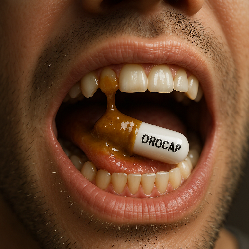 Unlike regular capsules that are swallowed, Orocap is designed to be chewed so that its active phytotherapeutic paste is released directly into the mouth. This allows powerful bioactive ingredients to coat, penetrate, and nourish the oral tissues for maximum effectiveness.